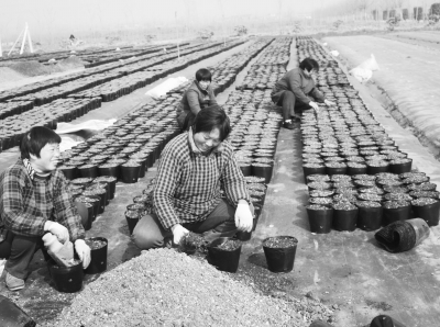 图为该县营养钵育苗合作社使用营养土养料平衡技术在给华联园艺公司灌装花卉营养钵。仅此一项,将带动该公司花卉育苗节本增效10多万元。