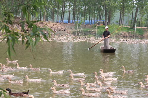 今年4月,该合作社已向国家商标总局注册了“斗龙港”牌系类禽蛋商标。生态鸡鸭鹅蛋产品销往上海、南京、苏锡常等地农产品超市,受到消费者的青睐,截至5月初,合作社已为社员增加收入150多万元。图为5月7日,该社合作社员在斗龙港河道里放养鸭子。