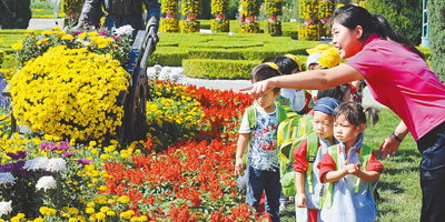 “双节”临近,北京园博会参展城市市花展在世界花卉大观园与游人见面。市花展以59个国内参展城市市花及花语为主要内容,通过展板和特色植物,向游客展示参展城市展园的设计理念及效果图。据悉,活动为市民提供了1万张北京园博会预展期门票。图为9月26日,小朋友们在老师带领下在世界花卉大观园里赏花。 李维娜 摄