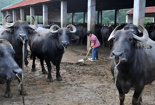 3月27日,广西灵山县灵城镇谭礼村帽岭奶水牛养殖基地的工作人员在清理奶水牛牛栏。2012年灵山县全县有奶水牛4.2万头,产鲜奶3.5万吨。仅标准化的奶水牛养殖小区就有28个,存栏13000多头。