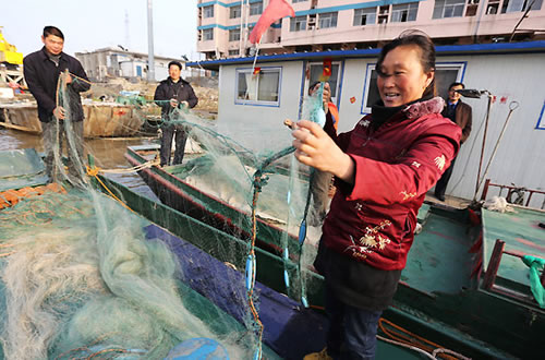 3月31日,在长江江苏省泰州市段永安洲渔港附近,渔民在整理渔具,准备休渔。