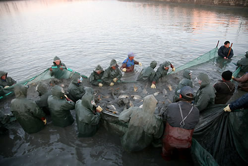 当日,天津市换新水产良种场的工作人员忙着打捞亲鱼,比往年提前10天开始进行春季种苗孵化工作。 位于天津市宁河县的换新水产良种场是我国北方大型种质资源库,已培育推广了8种淡水养殖鱼类新品种,2012年销售各种鱼苗达42亿尾,2013年的鱼苗订单总计50多亿尾。任丽华 摄