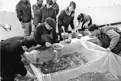 4月17日,工作人员在打捞黄金鲫鱼苗。当日,天津市国家级大型水产育苗基地——宁河县换新水产良种场培育的两亿尾黄金鲫鱼苗从天津起程,随前来购买鱼苗的养殖户一起,南下江苏等地。 任丽华 摄