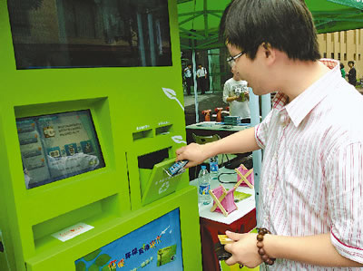 15日开幕的上海节能周上,电子废物物联网智能回收箱在现场亮相。市民投入灯管、电池等小型电子废物时,只需刷“阿拉环保”会员卡或输入手机号,就可获相应积分,并转换为银行卡内的“真金白银”。电视机等大件电子废物也可进行回收预约。据悉,回收箱今年将在全市推广布点50台,明年将达到200台—300台。 励漪 摄