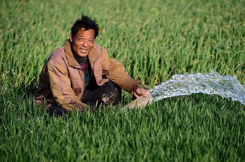 3月20日,在菏泽市成武县九女集镇,一位村民在给小麦浇水。