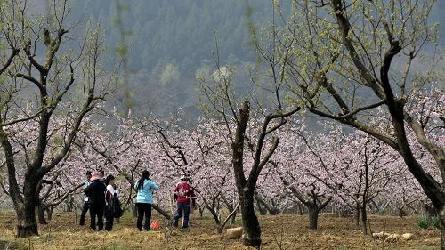 4月8日,游人在北京市平谷区观赏盛开的桃花