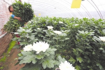 6月18日,山东省即墨市店集中心社区大官庄村花农在采收准备出口的菊花。据悉,当地农民严格按照国际花卉标准种植菊花,产出的鲜切菊花畅销海外市场。