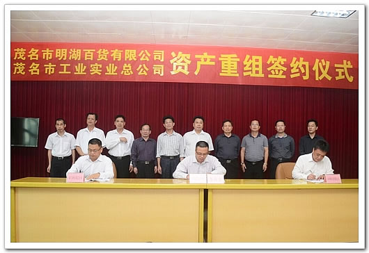 10月15日,茂名市供销社直属企业茂名市明湖百货有限公司与茂名市工业实业总公司(市国有资产经营公司下属公司)在茂名市国有资产经营公司的协助下,在三方公司主要领导的见证下,举行了简单而隆重的资产重组签约仪式。仪式上,茂名市明湖百货有限公司、茂名市工业实业总公司与茂名市国有资产经营公司签订了三方协议——《资产重组协议书》。