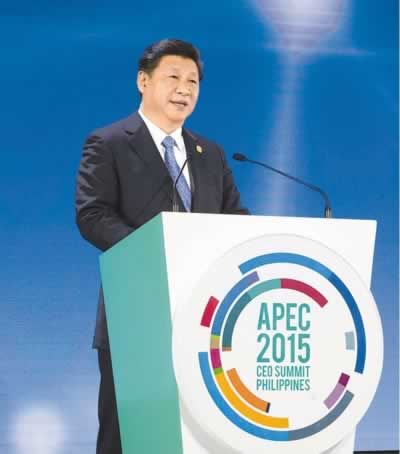2015年亚太经合组织工商领导人峰会18日在菲律宾马尼拉举行。国家主席习近平应邀出席并发表题为《发挥亚太引领作用 应对世界经济挑战》的主旨演讲,强调亚太各经济体要勇于担当、同舟共济,坚持推进改革创新,坚持构建开放型经济,坚持落实发展议程,坚持推进互联互通,努力推动全球经济增长。中国发展将更加注重效益质量、注重创新驱动、注重公平公正、注重绿色低碳、注重对外开放。