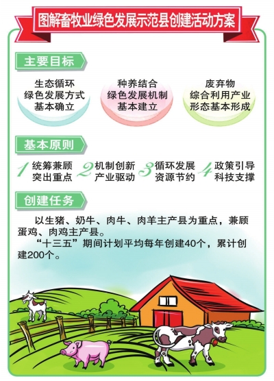 为深入贯彻落实五大发展理念,推动畜牧业转型升级,4月19日,农业部组织召开畜牧业绿色发展示范县创建启动视频会议,部署启动畜牧业绿色发展示范县创建活动。农业部副部长于康震强调,要以畜牧业生产和环境保护协调发展为目标,力争到2020年,在全国创建200个畜牧业绿色发展示范县,示范带动全国畜牧业可持续发展,走产出高效、产品安全、资源节约、环境友好的畜牧业现代化道路,实现畜牧业发展和环境保护“双赢”。