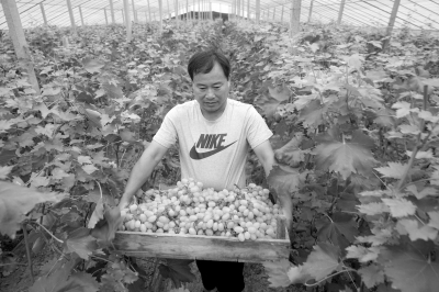 7月22日,山东广饶县广饶街道万润果蔬合作社的农民在采摘葡萄。广饶街道万润果蔬合作社的农民通过引进新品种,使用有机肥料等措施,使农产品的附加值不断增加,促进农民增收。 邢广利 摄