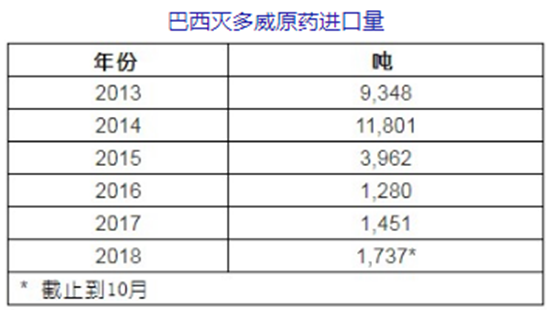 截止到2018年10月,巴西今年灭多威原药的进口量达1,737吨。产品从中国进口,其中260吨来自台湾。只有44%灭多威+3.5%氟酰脲这一混合制剂产品从以色列进口,共计75.2万升(数据来自AllierBrasil进口报告)。