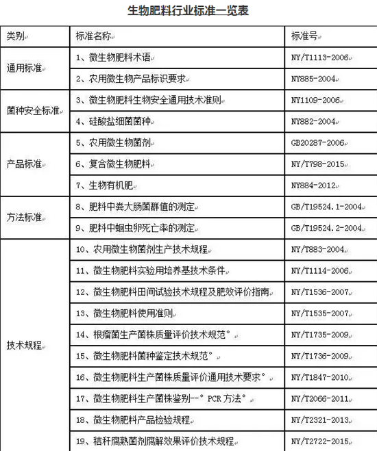 目前我国生物肥料行业通用标准2项,菌种/安全标准2项,产品标准3项,方法标准2项,技术规程/规范10项,这些标准是产业标准化、规模化、规范化的前提和基础。