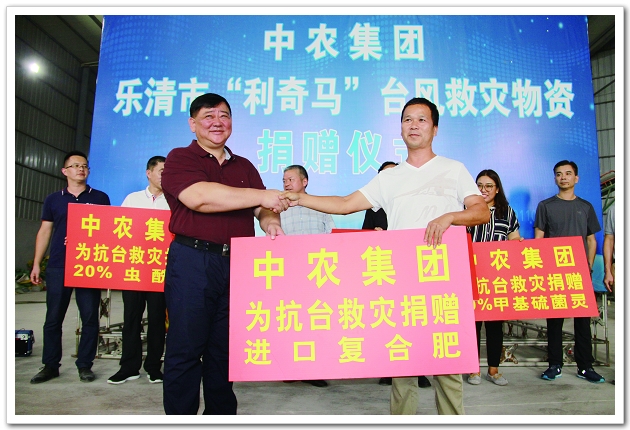 近日,超强台风“利奇马”为浙江、山东等地的农业生产带来巨大影响和灾害,众多农资龙头企业积极参与灾后重建工作。图为8月20日,中农集团紧急调运价值100余万元的化肥、农药等农资捐赠浙江乐清灾区。