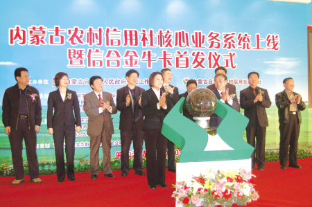 “内蒙古农村信用社核心业务系统上线暨信合金牛卡首发仪式”由内蒙古自治区人民政府金融工作办公室和内蒙古自治区农村信用社联合社共同主办,内蒙古自治区副主席布小林出席首发式并讲话,自治区金融办主任宋亮主持了仪式。