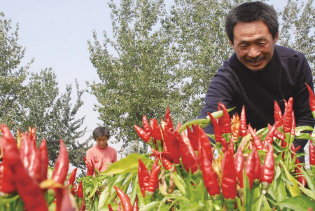 金秋时节,山西运城、临汾两地近三百万亩小辣椒喜获丰产丰收。这是山西省“双千双百惠农工程”和山西省农村信用社“三千三百惠农工程”结出的硕果,小辣椒将使农民钱包增收超亿元。图为山西运城新绛县娄庄村农民在采摘小辣椒。