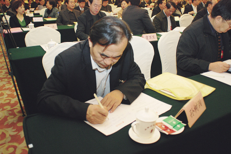 与会代表们全神贯注地阅读会议报告和相关材料。