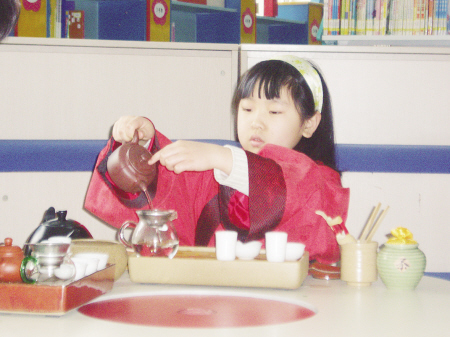 春节期间,北京锦武嘉业茶文化推广中心举办了一期中华茶道初级培训班。2月3日,在北京市西城区青少年儿童图书馆,茶艺班举行了结业汇演。7岁的王惠庭正在读小学一年级,她表演起茶艺来有板有眼,毫不逊色于专业人士。