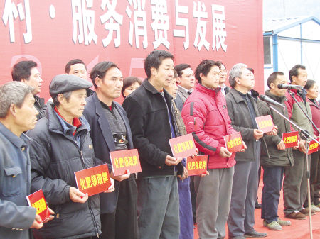今年“3.15灾区行活动”是由成都市工商局组织,以“心系灾区 维权进村 服务消费与发展”为主题,这一活动旨在加强农村消费维权工作,宣传名优产品,支持灾后重建,促进当地经济发展。作为西南地区最大的复合肥供应商,在得到成都市工商局的邀请后,新都化工迅速成立活动专项小组,积极筹备物资,公司高层明确指示,企业要为灾区恢复春耕做出最大力量。3月9日至12日,新都化工积极配合成都市工商局在崇州、彭州等重灾区开展的"维权下乡、支援灾区"的宣传及赠肥活动。