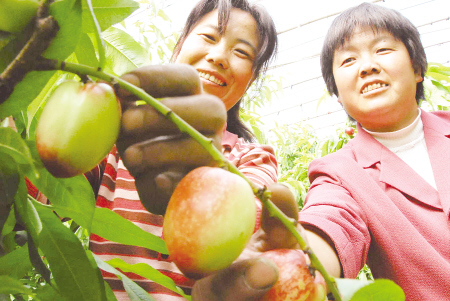近日,闻名全国的油桃之乡山西运城新绛县万安镇两千多亩温室早熟油桃和全市二万多亩温室早熟油桃争相开园上市,吸引了全国众多桃商抢先采购。近年,当地政府和涉农部门加大调产帮扶土地流转,使温室和大田有机油桃种植近三十万亩,桃农人均年增收达两千五百多元,种植油桃已成为当地农民增收的主打品牌产业。图为运城新绛县万安镇两名桃农为客商采摘温室早熟油桃。