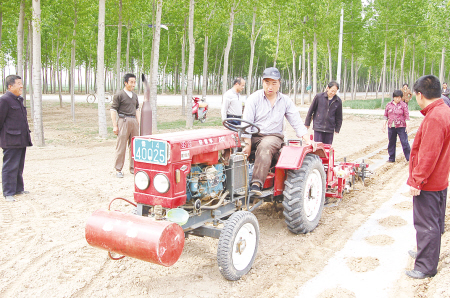 山东省武城县供销社组织的棉花专业合作社,根据当地棉农意愿,提供贴身服务。图为棉花专业合作社的棉花播种机正在为会员播种。
