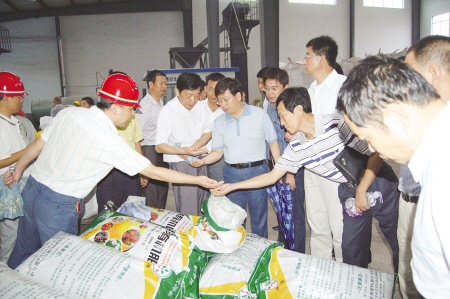 图1山东省供销合作社副主任刘力群、山东省农资协会副会长李文峰向工作人员详细询问新型有机肥料相关问题。