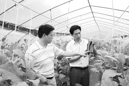 图为睢宁县供销合作社农技人员到专业合作社蔬菜大棚,察看茄子的长势情况。  王建华 摄