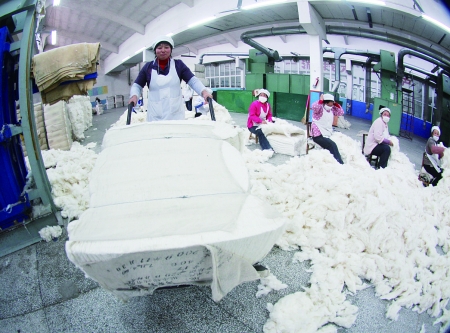 随着纺织企业用棉量的上升,近日,棉价再度发力走高,部分地区三级棉的提货价已经报到1.62万元/吨,受此影响,与棉花相关的棉短绒、化纤等价格也纷纷上涨。分析人士认为,由于近年来全球棉花的种植有所减少、库存下降,棉价在年内维持高位运行的几率大。图为国内一纺织企业生产车间。中新社传真 徐瑞平 摄