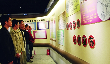 日前,浙江省遂昌金矿有限公司分批组织员工参观安全教育室,通过展板、实物展示和现场讲解的方式,对员工进行安全警示教育,筑牢员工安全思想防线。右图为该公司员工正在观看安全事故展览。   吕伟民 摄
