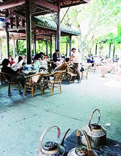 小镇的茶馆,几把竹藤椅,满桌盖碗茶,朴质无华,一种经典。随意走进一间茶馆,一幅鲜活的市井画卷便会呈现在你的眼前:茶烟聚散中,或听戏遛鸟、或打盹小憩,或看书读报,或摆龙门阵,时不时还有掏耳朵的、擦皮鞋的、卖小吃的游走其间,大家都悠闲逍遥,自取其乐。见有茶客落座,右手提长嘴铜茶壶,左手卡住茶船和白瓷碗的掺茶师傅便走过来点头致意,道声“给你泡杯三花”。话音刚完,只见他左手一扬,“哗”的一声,一个茶船脱手飞出,刚在茶桌上停稳,又听“咔”的一声,白瓷茶碗便放入了茶船;而右手则高举,一股水柱临空而降,水泻茶香,瞬间壶水又戛然而止,仔细一瞧,茶水恰与碗口平齐,却无半点溅出碗外。这种冲泡盖碗茶的绝技,往往使人惊叹不已,成为一种爽目的视觉享受。