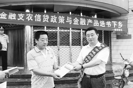 7月中旬,河北省廊坊城郊联社为了推动现代农业和区域经济的发展,积极组织开展送金融知识下乡等活动。图为城郊联社工作人员正在向仇庄乡农户赠送金融图书和信用社宣传材料。 王文婧 陆士东 摄