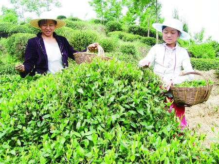 茶农的女儿早当家,放了暑假学采茶。图为著名的陕南茶乡西乡县峡口镇磅村五年级学生乔盼盼(右),与妈妈张桂琴在自家茶园采摘茶叶的情景。 韩星海 图/文