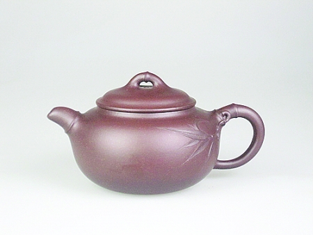 在做壶的过程中,徐飞先后创作了一组对壶,是以竹为题材,将佛肚竹的造型融入球形壶体中。两把壶的壶身同时都饰有双皮带线来体现竹的特征。她们的钮各有不同:一把以圆珠为钮壶把为弯把;另一把壶的钮为嫩竹枝造型,盘于壶盖之上,颇有生趣,其把向外延伸,犹如一根飘逸的竹枝,使原本圆润厚重的壶变得灵动生趣。此对壶兼具实用性和审美性。如果一入市,肯定要被仿制。在一次偶然的机会,我的对壶申请到了专利,并在《中国紫砂原创专利作品集》中刊登。这样别人仿制,徐飞追究起来也就有法可依了。