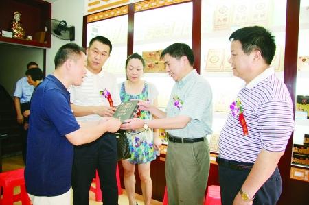 湖南中茶茶业有限公司整合下属的湖南省安化茶厂,近年来开发传统“中茶”牌安化黑茶产品和红茶系列产品,打造“中茶黑茶园”形象品牌终端销售模式,开拓国内外销售市场取得了显著成效。图为9月16日,中国茶叶股份有限公司董事长徐尚风(右二)在湖南中茶公司总经理熊嘉陪同下在长沙“中茶黑茶园”品牌形象店了解市场销售情况。 黄德开 摄