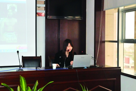 图为本报首席记者蔡靓在讲课中为农村金融从业者分析案例。