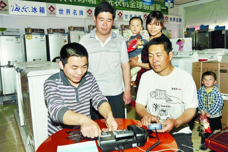 图为费县方城镇西石桥村村民续连超在方城镇西石桥村永宏家电商场通过费县农村商业银行系统内电话POS刷卡支付购买家电款。刘涛  柴士高  图/文