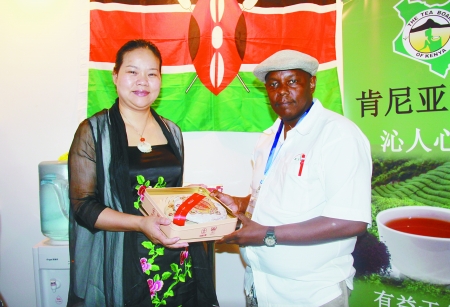 不久前落幕的“2012北京国际茶业展”上,中国第一枚茶生肖票首发仪式受到人们的关注,19日北京展览馆肯尼亚展位上中国茶生肖票再一次掀起热浪。中国茶票交易中心董事长林振芳,将与茶龙票配伍的甲拉一号普洱茶,亲自赠送给了在此宣传肯尼亚茶的肯尼亚驻华大使馆商务专员乔治·盖夏卡。盖夏卡高兴地说:“我喜欢!” 本报记者 张永立