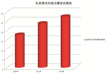 截至2012年底,全系统共兴办综合服务社27.5万个,比上年增加36642个,增长15.4%,比5年前增加9.8万个,增长55%。综合服务社已覆盖全国40%的行政村。每个综合服务社都拥有农资和日用消费品便民店,大部分综合服务社还设有庄稼医院、农副产品收购、再生资源回收、健身广场、图书室、老年活动中心、洗浴、餐饮、理发、婚礼丧葬等经营性项目,综合服务中心普遍开展了农业技术服务、信息服务、文化娱乐、体育健身、医疗、幼儿教育以及代理代办、就业指导、法律咨询、政务、警务等公益性服务,搭建起为农民提供生产生活文化等为一体的综合服务平台,实现经营性服务和公益性服务的有机结合。目前,综合服务社适应城乡居民日益多样化的需求和城镇化的快速推进,加快向社区综合服务中心发展,逐步向城镇社区延伸。