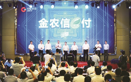 日前,安徽省农村信用社联合社举办“金农信e付”产品发布会,安徽省政府金融办副巡视员戴利强,人行合肥中心支行副行长丁伯平,六安市政府常务副市长陈家本,安徽银监局农金非现处处长李平,省联社理事长陈鹏、主任钟园、副主任孙斌出席发布会。