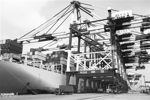图为青岛前湾保税港区码头,中远葡萄牙号货轮正在装船出口。