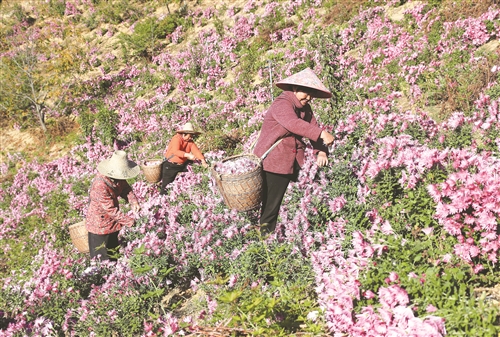 近日,安徽省黄山市歙县坡山农业科研种植基地培育嫁接种植的“徽州紫菊”竞相绽放,并喜获丰收,农民开始采摘。“徽州紫菊”是一种具有养生保健功效的植物,既具有较高的经济价值,又可以供村民和游客观赏,还美化了村庄周边环境。通过近3年来的不懈努力,歙县坡山农业科研种植基地培育嫁接种植的“徽州紫菊”获得成功,为振兴乡村经济和农民的增收致富开辟了一条新路,让绿水青山给山区农民们带来了金山银山。图为农民在种植基地采摘“徽州紫菊”。