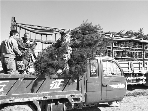 11月10日,陕西省永寿县监军街道办古屯村苗木花卉产业园工人把捆绑好的挖白皮松装上车,准备销往西安蓝田、周至。近年来,永寿县供销合作社根据市场需求,引导农民发展发展特色苗木花卉产业,栽植白皮松、月季苗木等,拓宽了农民的增收渠道。