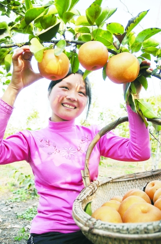 8月31日,河南省社旗县唐庄乡乔庄村村民乔小红在收获黄金梨。前年,乔小红从深圳市郊一家种植园打工返乡后,在5亩黄金梨梨园里探索立体种植模式,她在梨园下种植蔬菜,树上挂着黄金梨,既提高土地的利用率,增加了观赏趣味性,又增加收入。