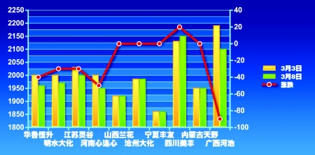 3月3日与3月8日国内部分生产企业出厂价格对比图(单位:元/吨) 《中国农资》制图