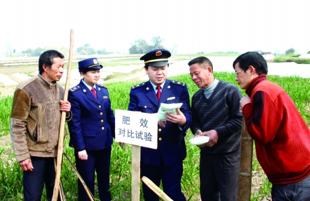 图为工商执法人员在永兴镇马架坪村给正在田间劳作的农民用优质肥和劣质肥做试验对比。