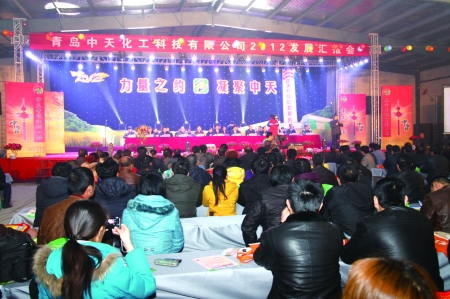 1月14日,对于青岛中天化工科技有限公司来说,是一个值得纪念和庆祝的日子。在当日公司精心筹划的2012年发展汇报会上,来自当地政府各有关部门的领导、200余名农资经销商及近600名种植大户共同回顾了青岛中天化工在2011年走过的不平凡历程,同时有幸见证了公司在新一年吹响的那曲气势磅礴、积极向上的“集结号”。