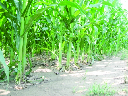 图1. 河南商丘试验田玉米试验效果。从生育期调查看,施用特普碳酶聚能玉米肥与施用其他品牌玉米肥的田地相比,主要表现在苗期叶色较浓绿,根系发达,生长旺盛。在玉米追肥期,对照田进行了二次追肥,试验田没有进行追肥,结果出人意料,较对照穗长平均增加1.1cm,穗秃尖率减少平均0.6cm,行粒数、百粒重均有增加,亩增产18.7斤,亩增效比2.9%。