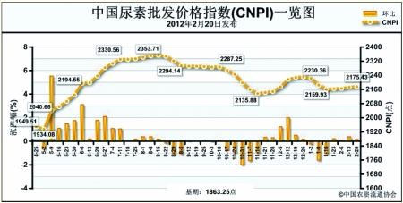 上周(2月13日-2月17日)国内尿素市场农业需求启动缓慢,价格稳中有涨。2月20日中国尿素批发价格指数为2175.43点,环比上涨2.62点,涨幅为0.12%;比基期上涨312.18点,涨幅为16.75%。指数持续4周缓慢上涨。