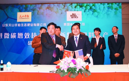 4月17日,山东天山丰耘生态肥业有限公司与美国BHN公司举行“引进微碳增效技术,创新复合肥料生产”战略合作签约仪式。微碳增效技术与目前市场流行的复合肥添加剂相比,具有生态环保、添加物可吸收等特点。山东天山丰耘公司成为首家引进美国BHN公司微碳增效技术的复合肥生产企业。签约仪式后,双方举行了新闻发布会,中国新闻社、中国农资传媒、山东电视台等媒体参与了提问。美国BHN公司执行董事袁磊在签约后的答记者问中提到,此次与天山丰耘公司的合作建立在双方了解互信的基础上,未来双方将联手推进微碳增效技术在中国农业上的应用。