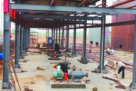 2012年湖北富邦化工公司实行产能扩建,新上三个项目分别是肥料防结剂及多功能包裹扩建项目、磷矿石浮选剂项目和肥料可以降解缓材料建设项目。目前,这三个项目建设进展顺利,计划总投资1.2亿元,目前已完成投资4000万元,磷矿石浮选项目即将完工。此三个项目建设后,每年可新增3.4万吨肥料防结剂、包裹剂产能,可形成年产1万吨磷矿石浮选剂、1万吨肥料缓释剂的规模,可年新增产值3.5亿元,新增税收2000万元。图为富邦公司相关项目扩建现场。 邓国军 摄